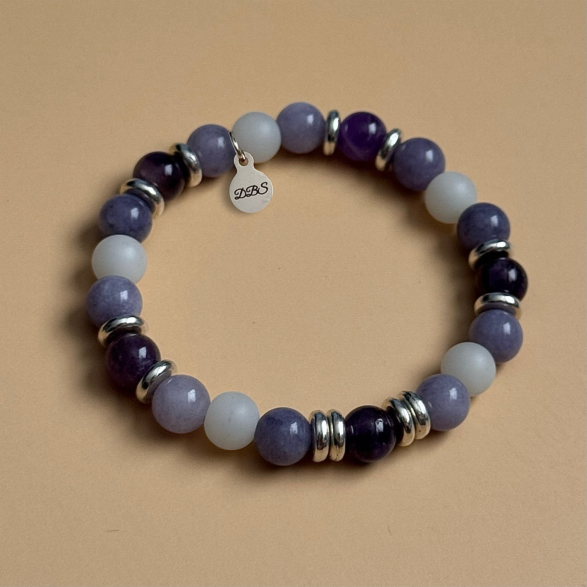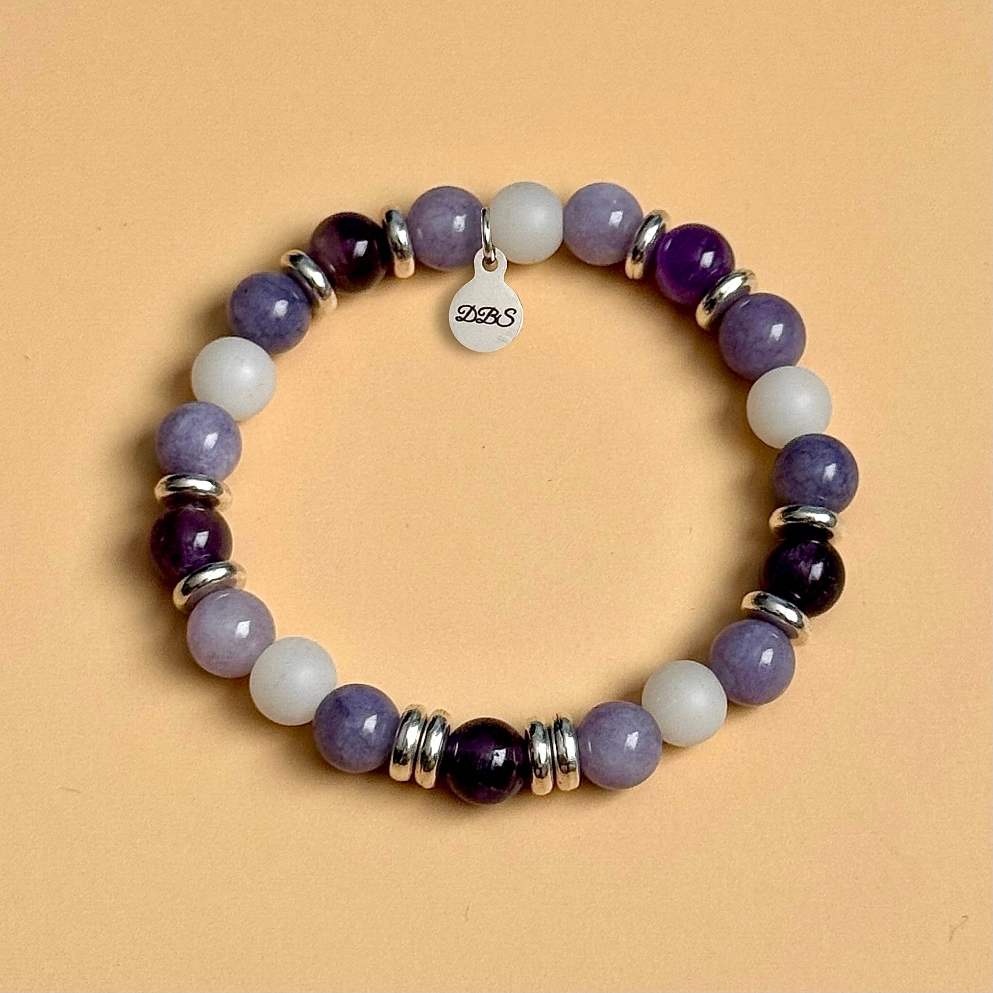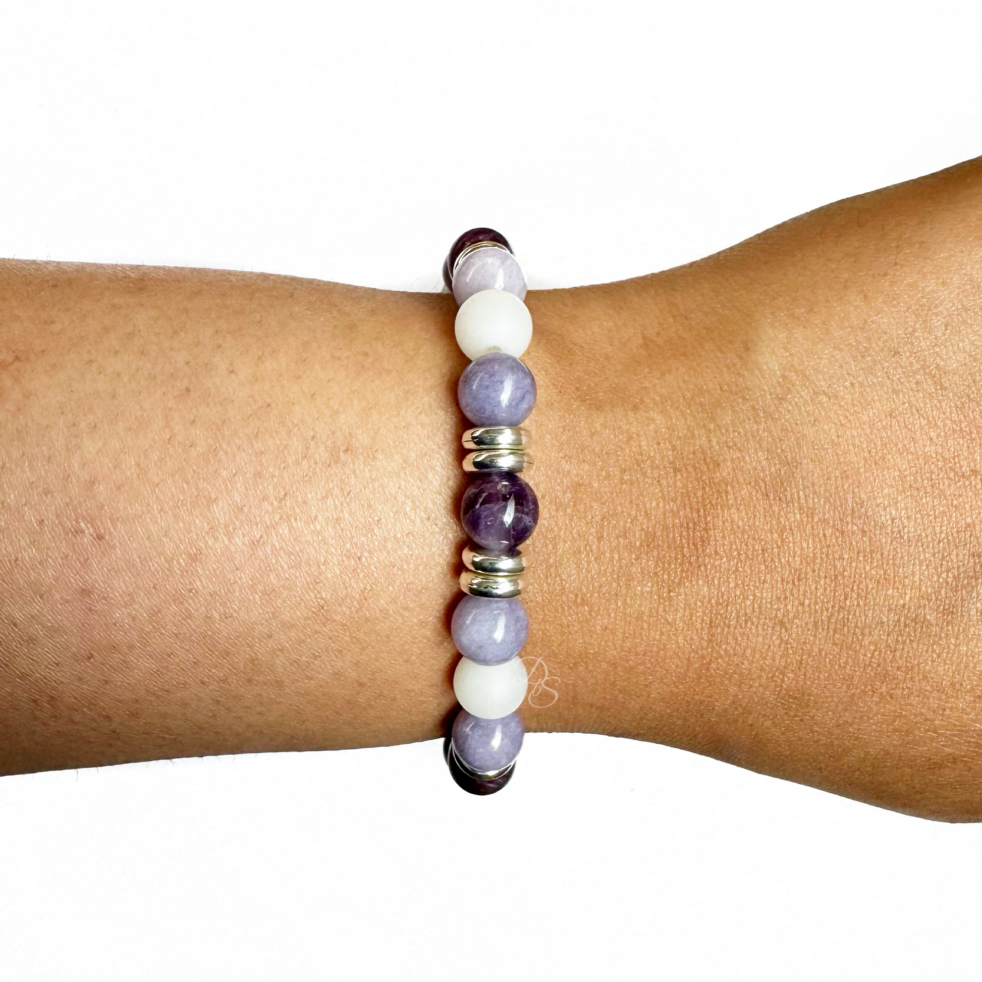 Created with 8mm Lavender Chalcedony, Amethyst, Matte White Quartz and silver accents.