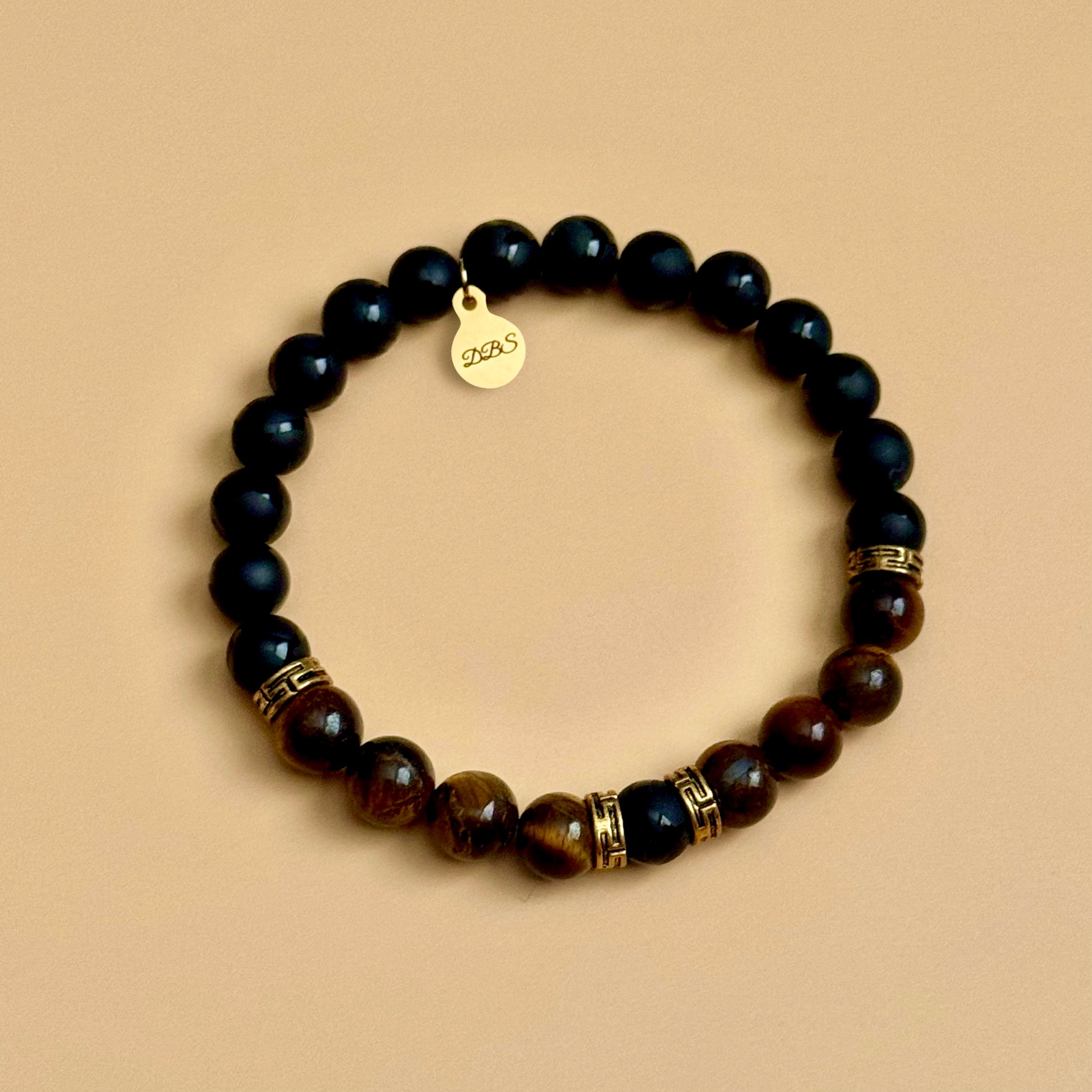 Beaded bracelet is created with a 8mm Tiger Eye, Banded Black Onyx with gold Barocco accents.