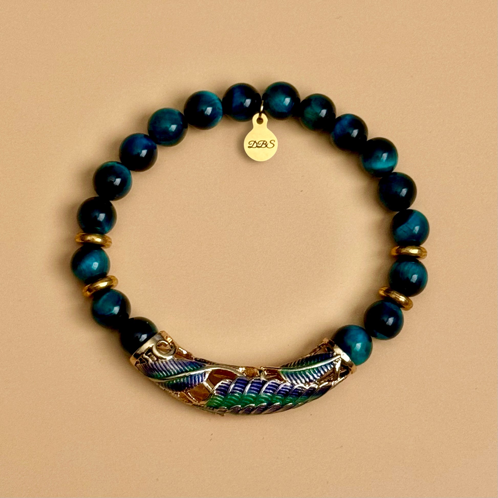 Created with a gold detailed peacock piece and 8mm Blue Peacock Tiger Eye with gold accents.