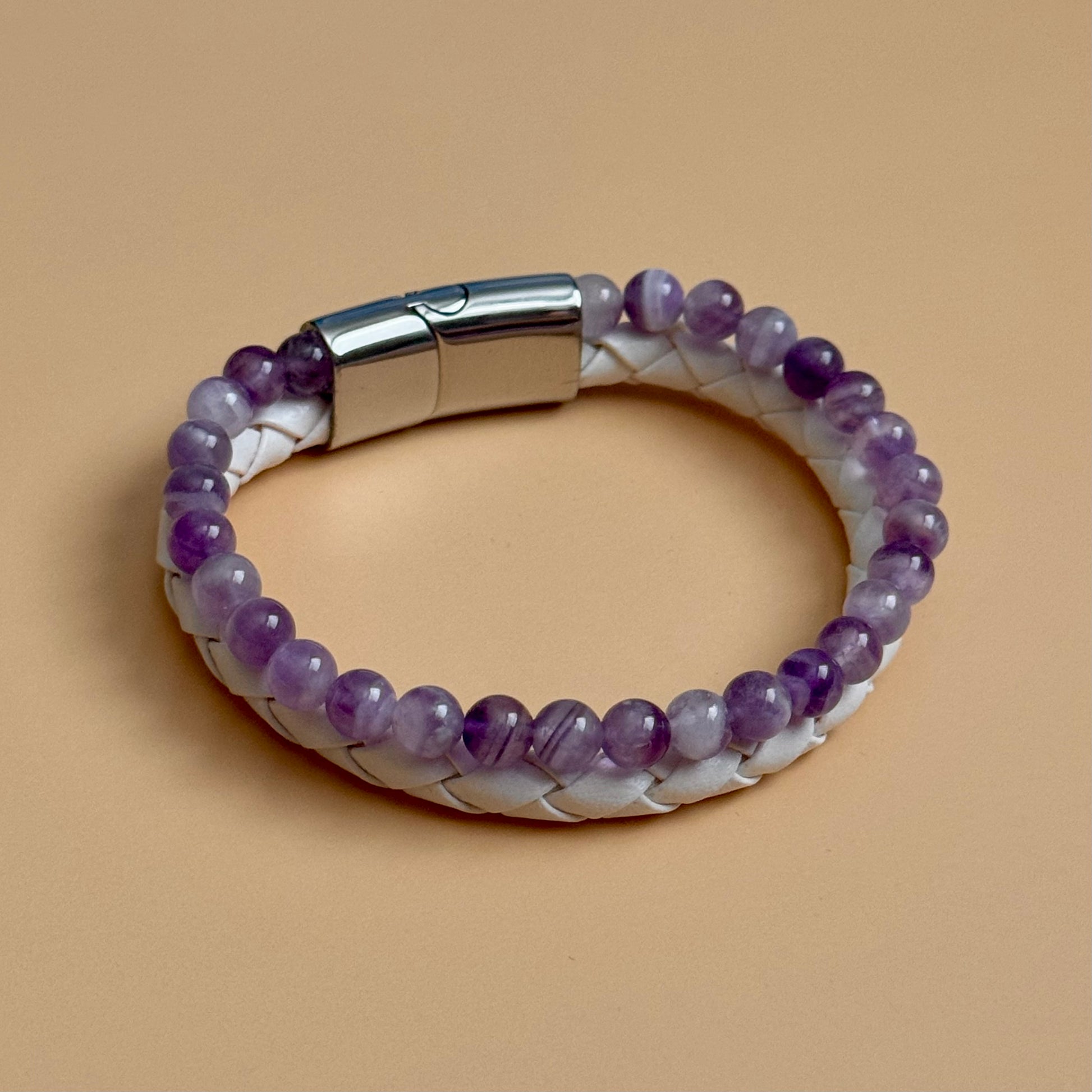Created with 6mm Amethyst Gemstone beads and white leather with a magnetic clasp.