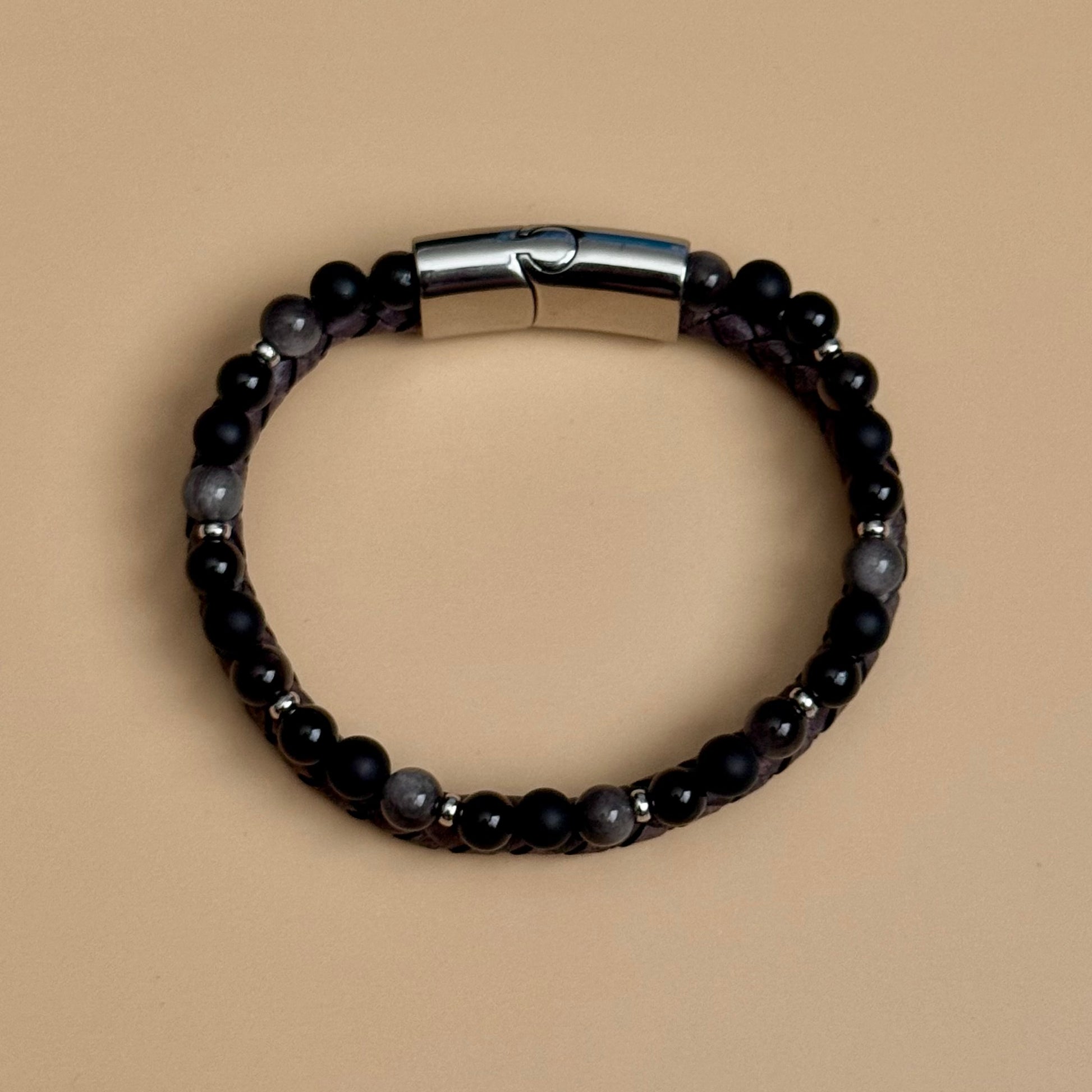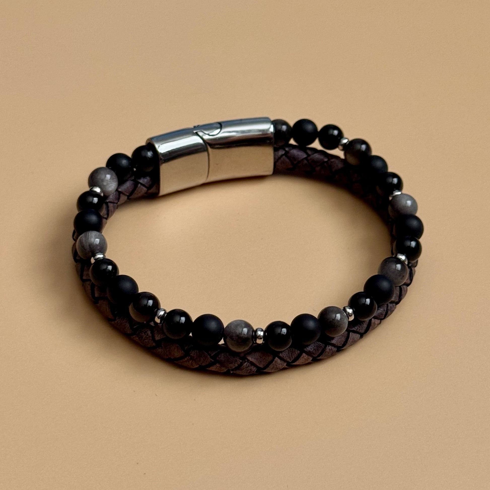 Created with 6mm Black Onyx beads, Gray Tiger Eye and distressed gray smoked leather with a magnetic clasp.