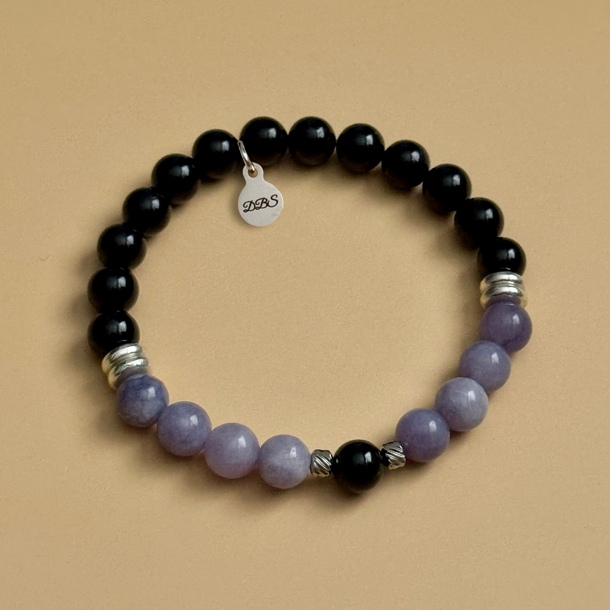 Created with 8mm Lavender Chalcedony, Black Tourmaline and stainless steel accents.