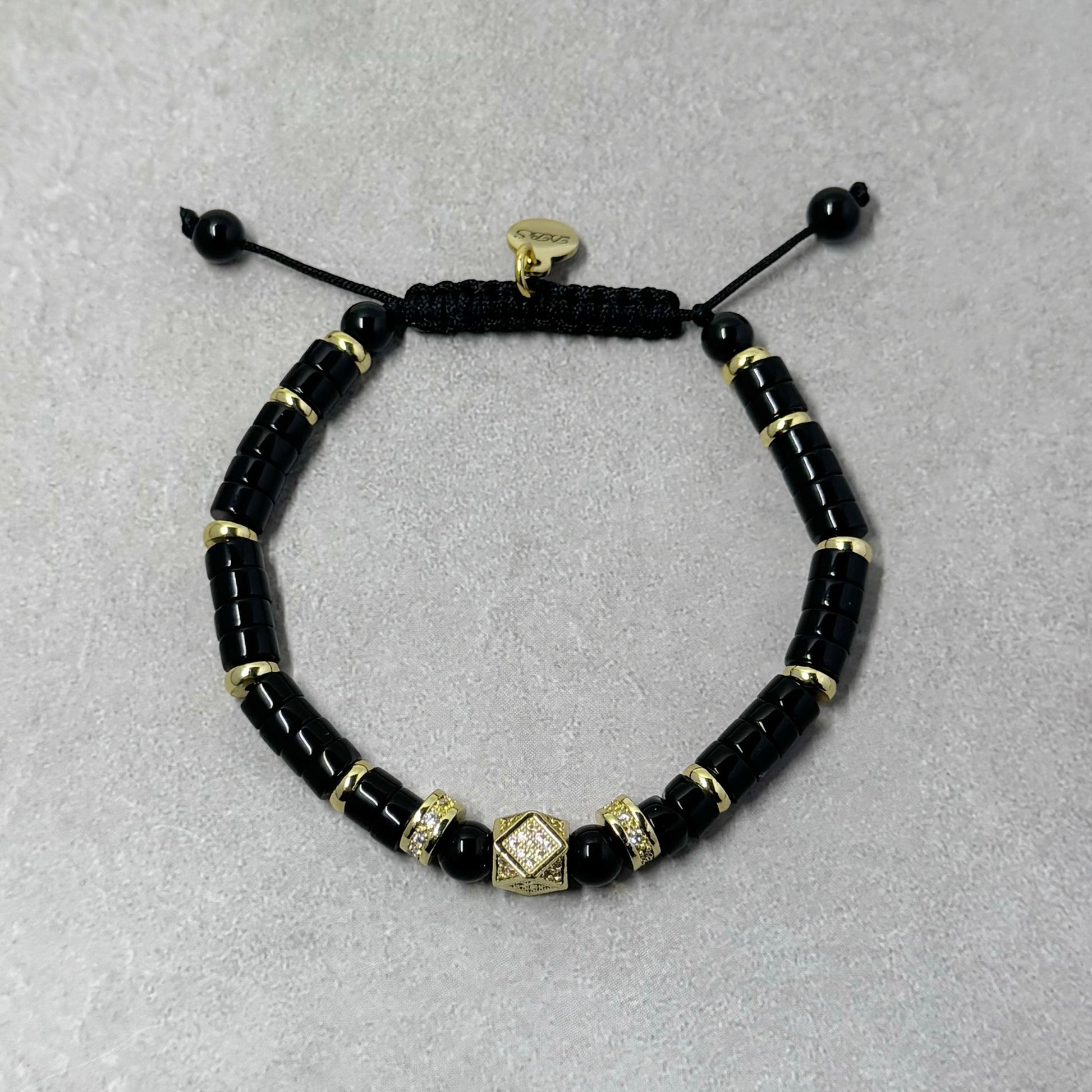 Handcrafted shamballa style bracelet created with nylon cord. Uniquely designed with 6mm Obsidian Heishi gemstone beads, gold pavé spacers and a gold pavé focal bead with our gold stainless steel logo charm.