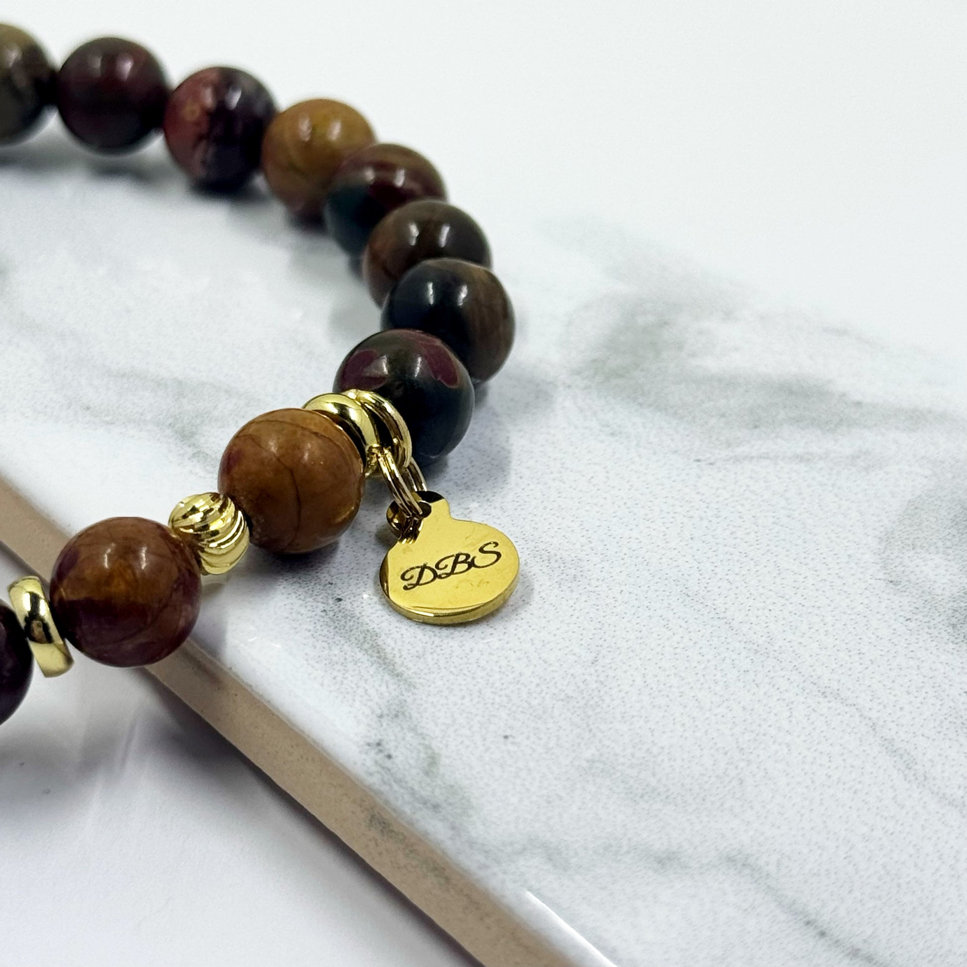 Uniquely designed with 8mm Red Creek Jasper gemstone beads, a gold pavé focal bead and gold stainless steel accents with our stainless steel logo charm.