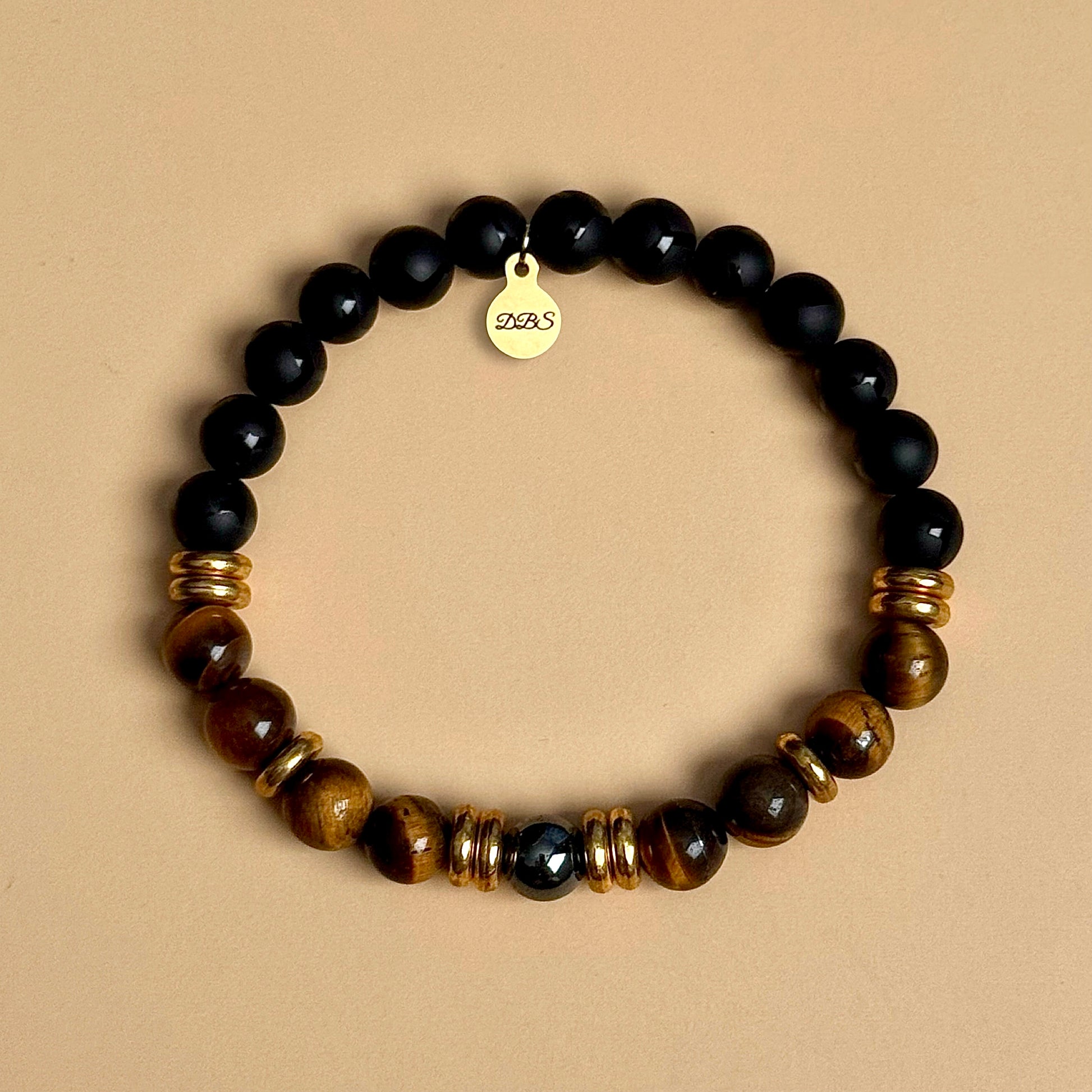 Created with 8mm Tiger Eye, Banded Black Onyx and a Hematite stone with gold accents.