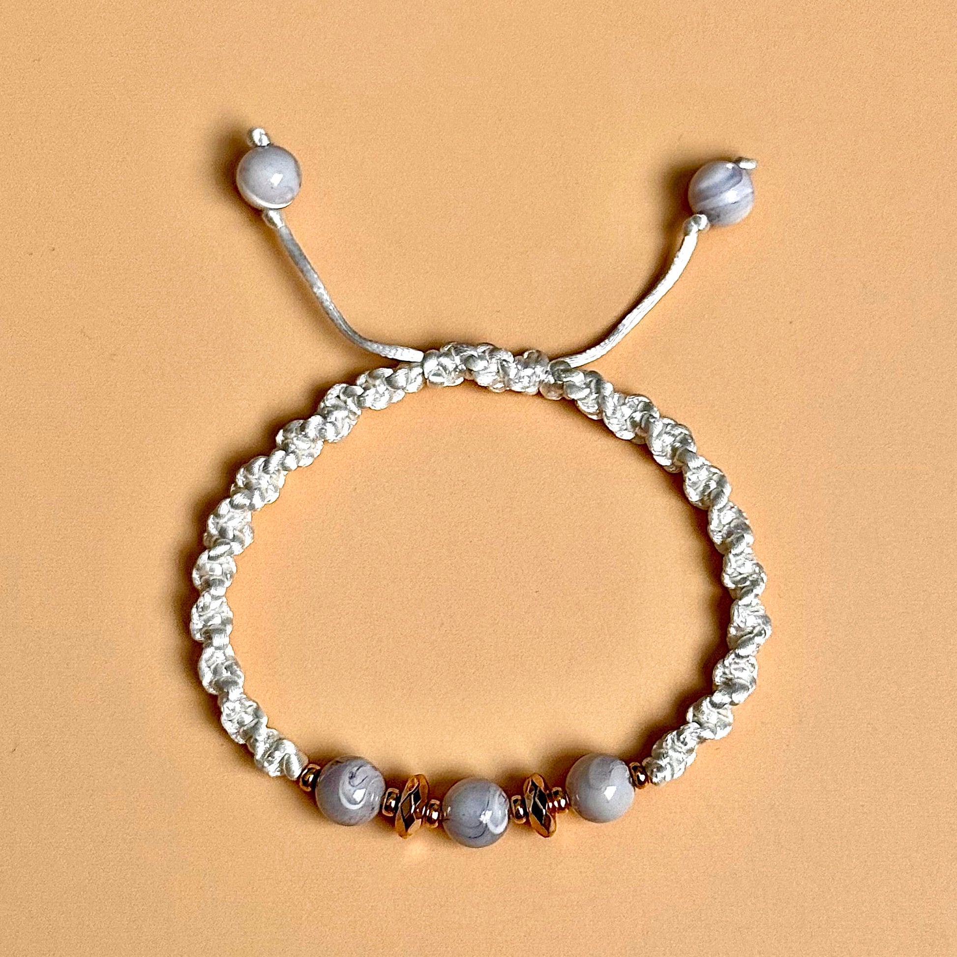 Jewelry Care: Avoid water and other liquids that would soften the nylon. After each wear, gently wipe your bracelet with your complementary jewelry cloth. Store each piece nicely in your velvet jewelry bag and box. Do not soak in harsh chemicals that could change the appearance of your bracelet. Water, oil and makeup can cause fading and discoloration.